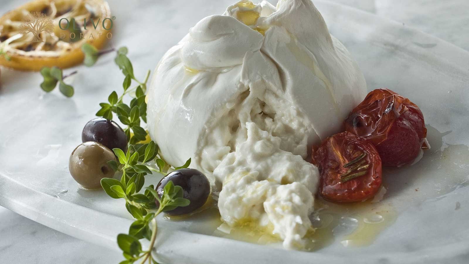 Burrata ist ein italienischer Frischkäse mit einer festen Hülle und einem cremigen Inneren aus Sahne und Käsefäden.